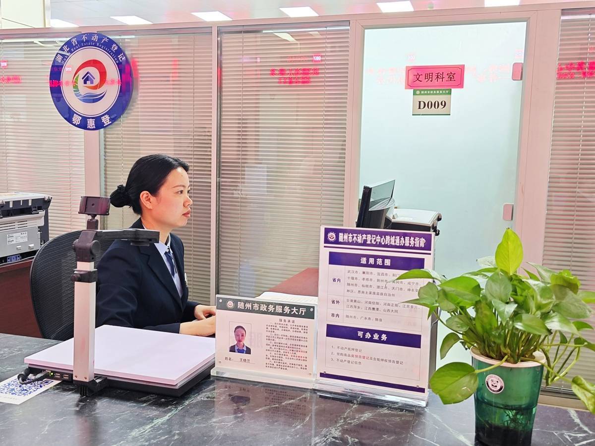 在随州市政务服务中心,不动产登记窗口工作人员王晓兰正通过系统为市民办理商品房备案预告业务。(通讯员供图)